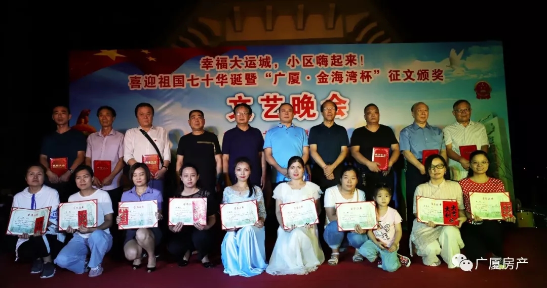 适逢祖国七十华诞之际,运城市广厦房产公司、安邑办事处金海湾社区、广厦.金海湾物业服务中心不忘初心,牢记使命,为弘扬国学文化,歌颂真善优美,全力提升城市品位和市民生活品质,与《古运新城》文化传媒隆重推出以“和谐社会、和睦小区、和美家庭”为主要内容的金海湾“三和文化”有奖征文活动,并举行“喜庆祖国七十华诞暨征文颁奖”文艺晚会,对获奖的优秀作品进行颁奖。